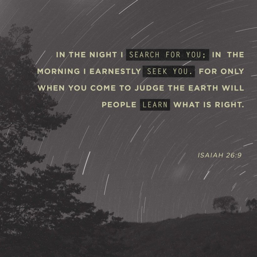 At night my soul longs for You, Indeed, my spirit within me seeks You diligently; For when the earth experiences Your judgments The inhabitants of the world learn righteousness.