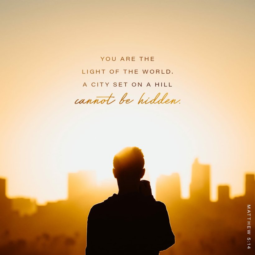 “You are the light of the world. A city set on a hill cannot be hidden; nor does anyone light a lamp and put it under a basket, but on the lampstand, and it gives light to all who are in the house. Let your light shine before men in such a way that they may see your good works, and glorify your Father who is in heaven.