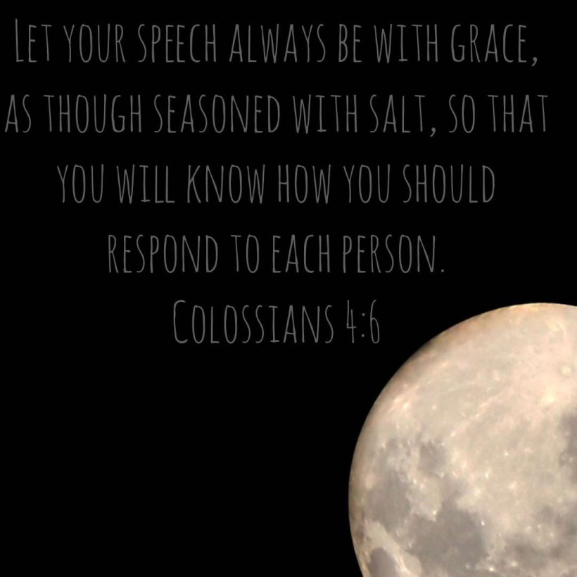 with grace. To speak what is spiritual, wholesome, fitting, kind, sensitive, purposeful, complimentary, gentle, truthful, loving, and thoughtful (see notes on Eph 4:29–31). seasoned with salt. Just as salt not only flavors, but prevents corruption, the Christian’s speech should act not only as a blessing to others, but as a purifying influence within the decaying society of the world.