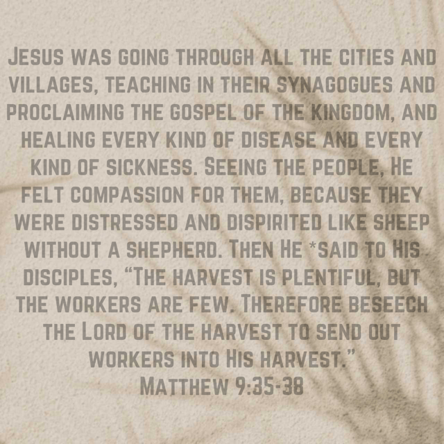 9:35-38 Jesus visited not only the great and wealthy cities, but the poor, obscure villages; and there he preached, there he healed. The souls of the meanest in the world are as precious to Christ, and should be so to us, as the souls of those who make the greatest figure. There were priests, Levites, and scribes, all over the land; but they were idol shepherds, Zec 11:17; therefore Christ had compassion on the people as sheep scattered, as men perishing for lack of knowledge. To this day vast multitudes are as sheep not having a shepherd, and we should have compassion and do all we can to help them. The multitudes desirous of spiritual instruction formed a plenteous harvest, needing many active labourers; but few deserved that character. Christ is the Lord of the harvest. Let us pray that many may be raised up and sent forth, who will labour in bringing souls to Christ. It is a sign that God is about to bestow some special mercy upon a people, when he stirs them up to pray for it. And commissions given to labourers in answer to prayer, are most likely to be successful.