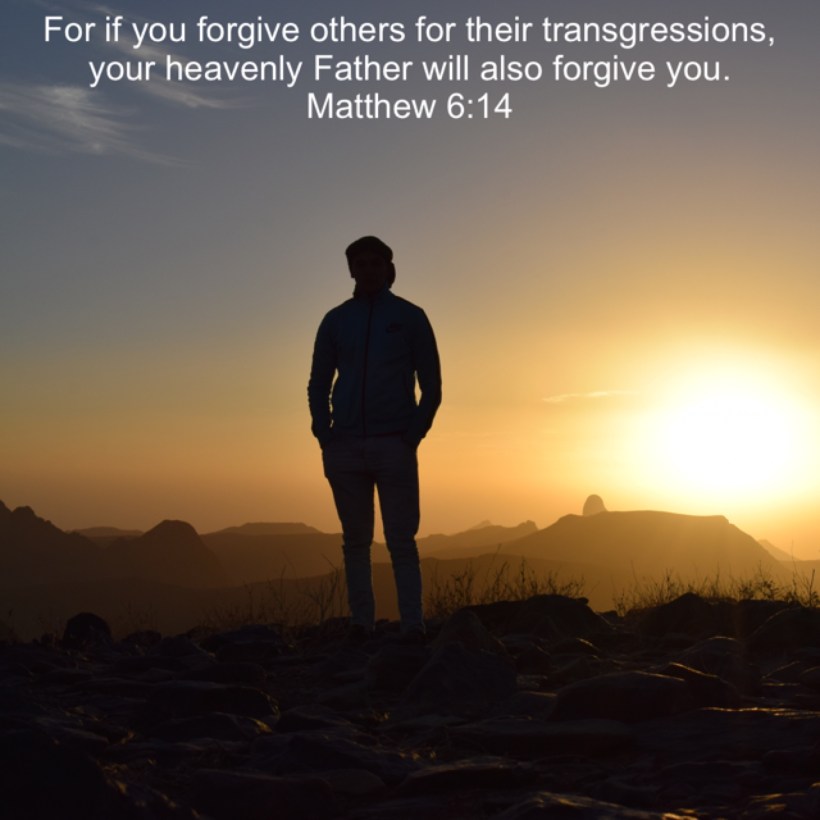 If we confess our sins, he is faithful to forgive us our sins, and to cleanses us from all unrighteousness. This is not a one time thing. It is ongoing in, not only asking God to forgive us, but also forgiving others. How beautiful a picture of Love. It sounds easy enough, but in reality, it is not always easy for me. Father, forgive me when I am holding on to something, I need to let go of. May 26, 2021 Arw27 www.bible.com/100/mat.6.14.nasb1995 Share this: Click to share on Facebook (Opens in new window) Facebook Click to share on Pinterest (Opens in new window) Pinterest Click to share on LinkedIn (Opens in new window) LinkedIn Click to share on X (Opens in new window) X Click to email a link to a friend (Opens in new window) Email More Click to share on X (Opens in new window) X Like Loading...