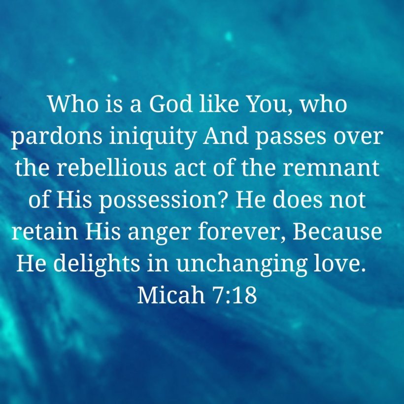 Who is a God like You, who pardons iniquity And passes over the rebellious act of the remnant of His possession? He does not retain His anger forever, Because He delights in unchanging love.