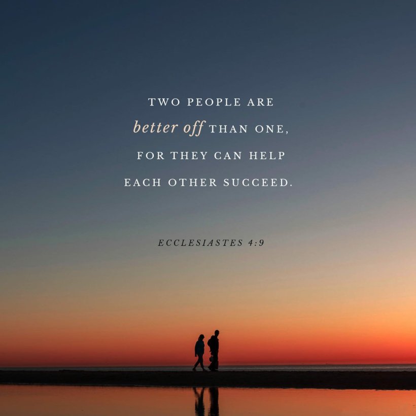 Two are better than one because they have a good return for their labor. For if either of them falls, the one will lift up his companion. But woe to the one who falls when there is not another to lift him up.