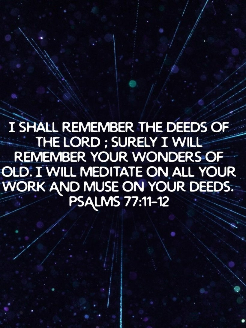 I shall remember the deeds of the Lord ; Surely I will remember Your wonders of old. I will meditate on all Your work And muse on Your deeds.