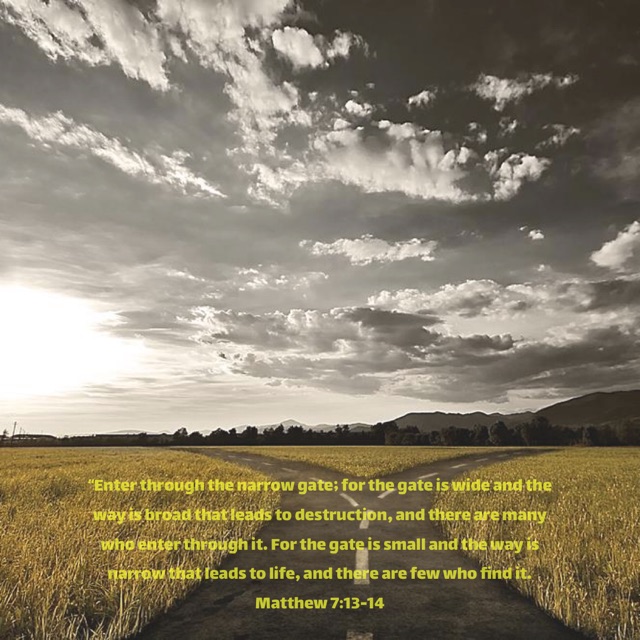Both the narrow gate and the wide gate are assumed to provide the entrance to God’s kingdom. Two ways are offered to people. The narrow gate is by faith, only through Christ, constricted and precise. It represents true salvation in God’s way that leads to life eternal. The wide gate includes all religions of works and self-righteousness, with no single way (cf. Ac 4:12), but it leads to hell, not heaven.