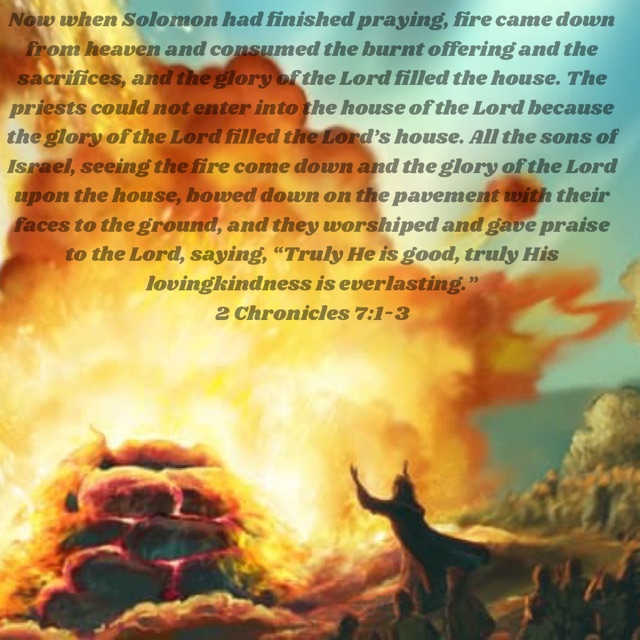 “Now when Solomon had finished praying, fire came down from heaven and consumed the burnt offering and the sacrifices, and the glory of the Lord filled the house. The priests could not enter into the house of the Lord because the glory of the Lord filled the Lord’s house. All the sons of Israel, seeing the fire come down and the glory of the Lord upon the house, bowed down on the pavement with their faces to the ground, and they worshiped and gave praise to the Lord, saying, “Truly He is good, truly His lovingkindness is everlasting.” Then the king and all the people offered sacrifice before the Lord.”